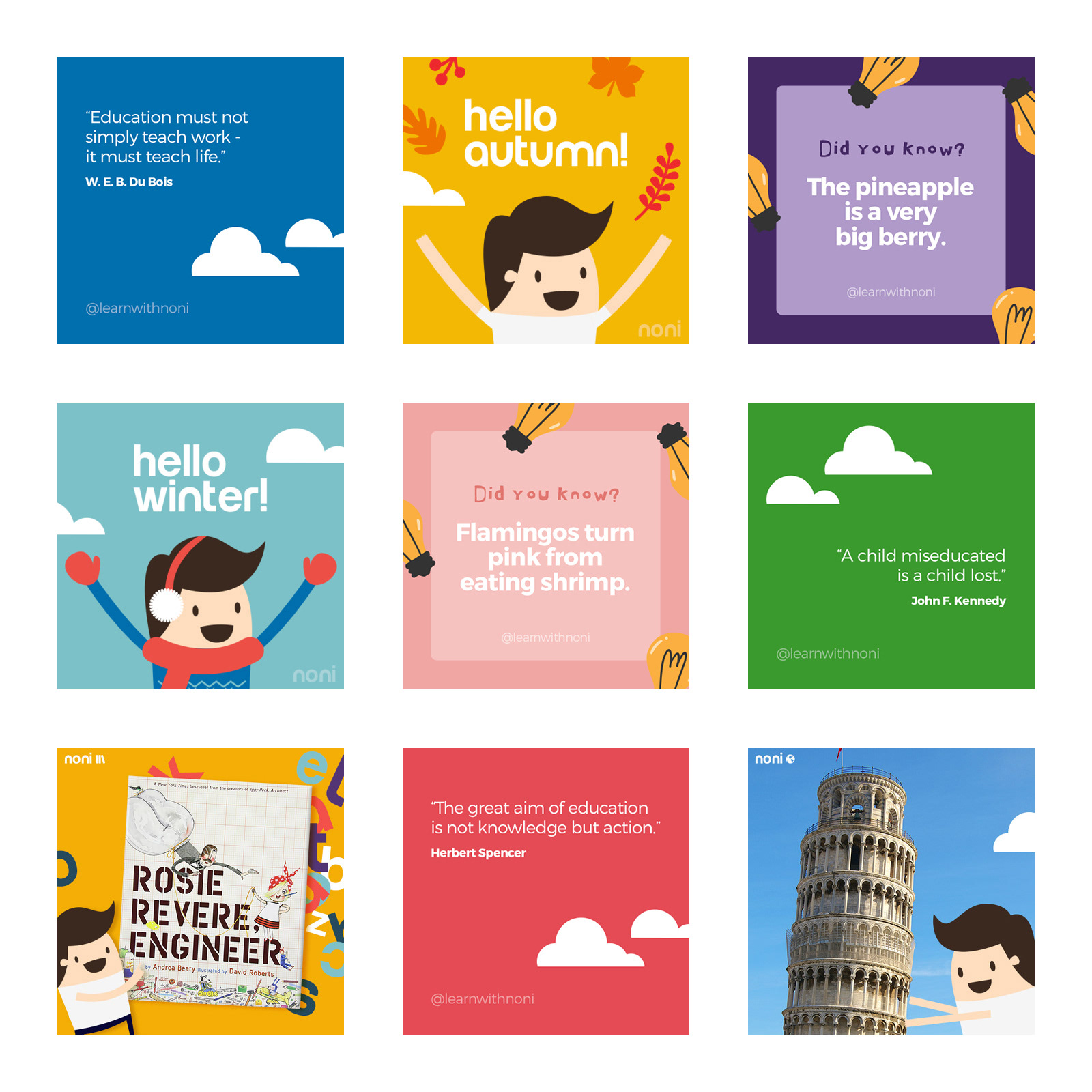 Noni is a hybrid digital and experiential learning platform designed for children ages 5 to 10, their parents and teachers. Uara Estudio was hired to design varied graphics for social media posts.
